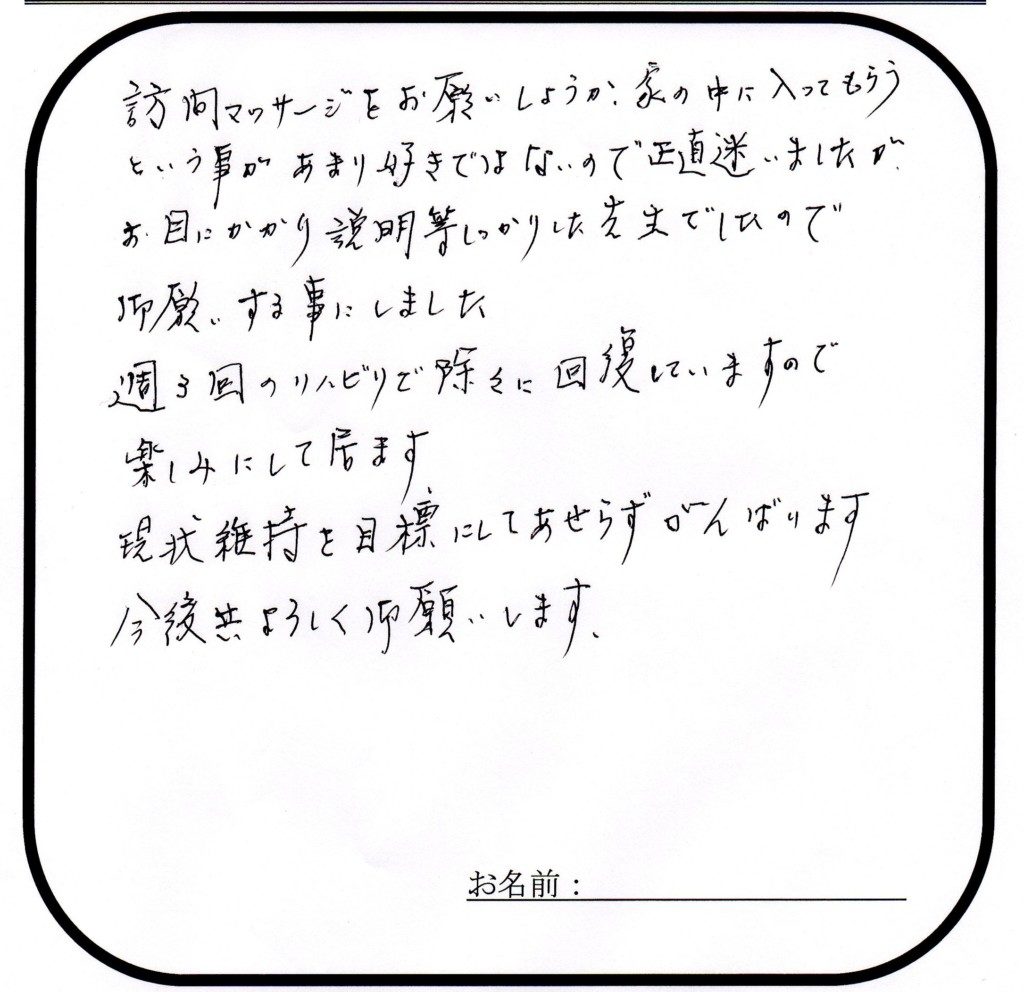 訪問マッサージをお願いしようか、家の中に入ってもらうという事があまり好きではないので正直迷いましたが、お目にかかり説明等しっかりした先生でしたので御願いする事にしました。