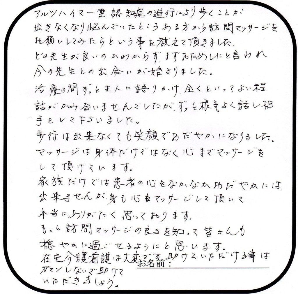 アルツハイマー型認知症の進行により歩くことが出きなくなり悩んでいたところある方から訪問マッサージをお願いしてみたらという事を教えて頂きました。