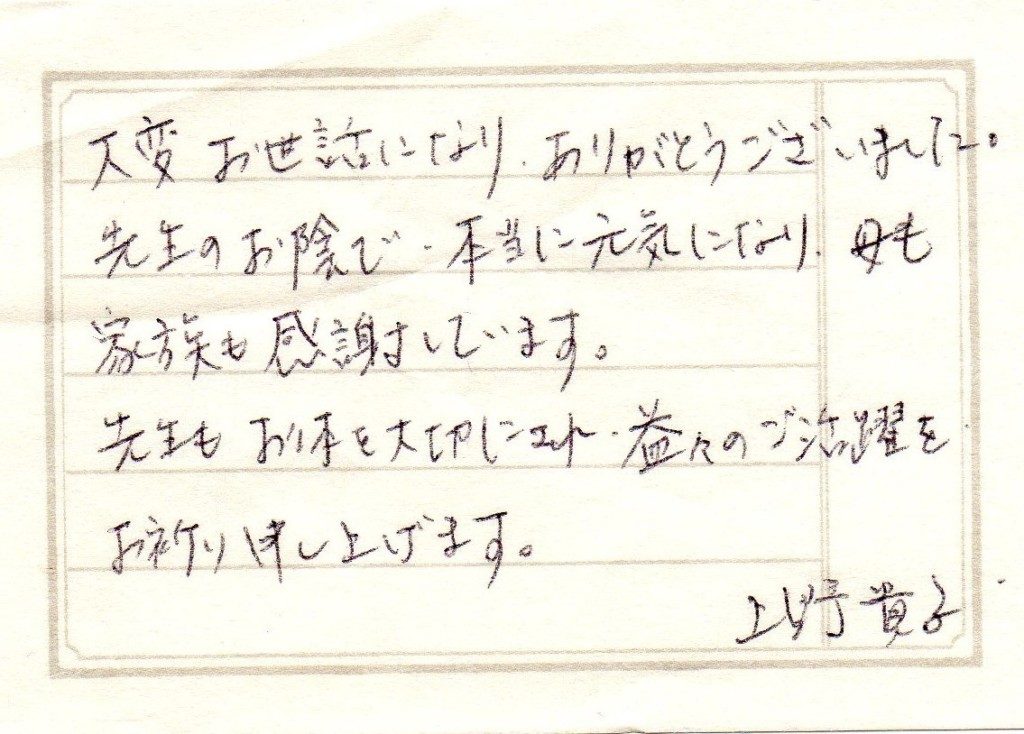 先生のお陰で、本当に元気になり、母も家族も感謝しています。